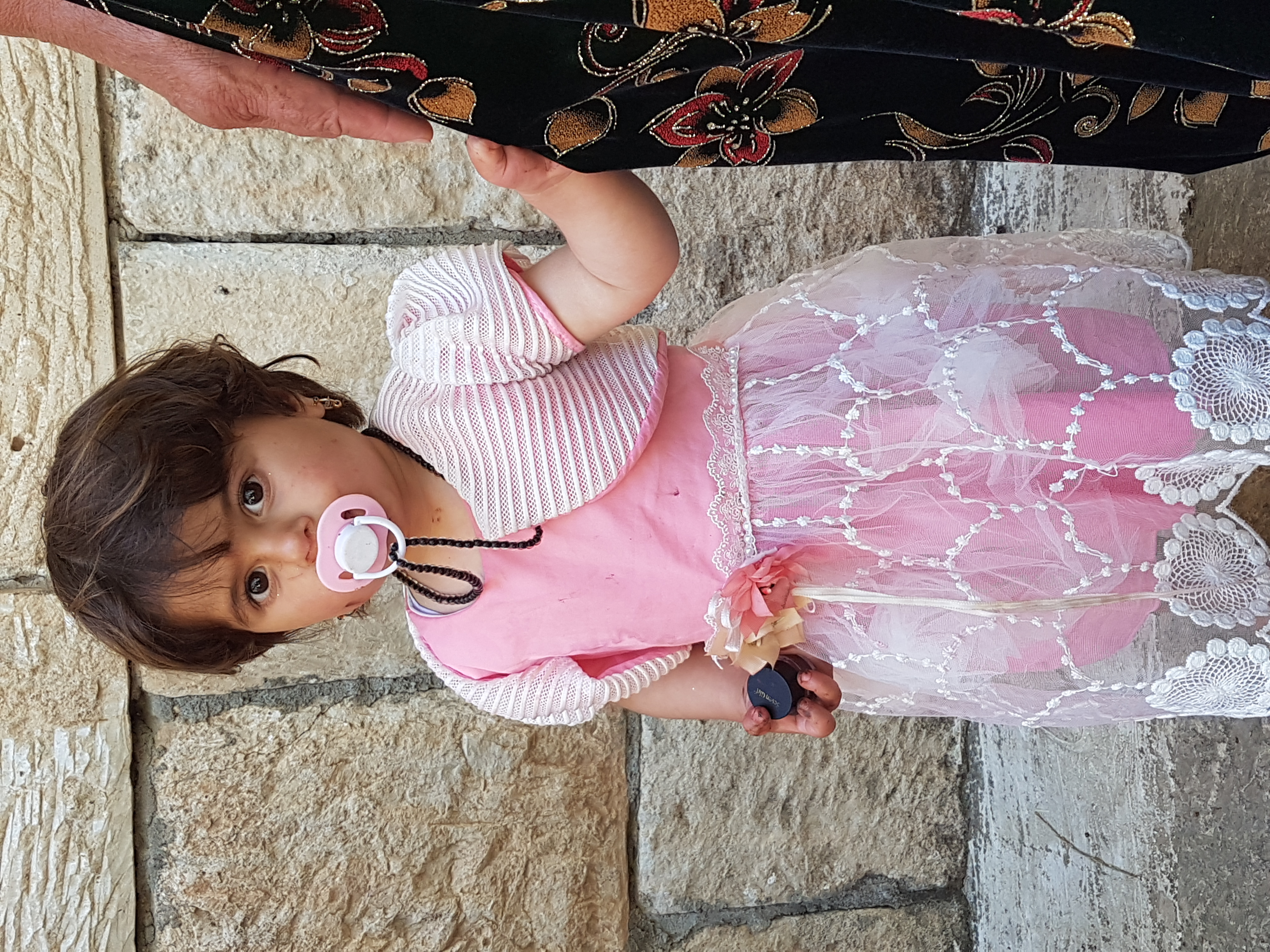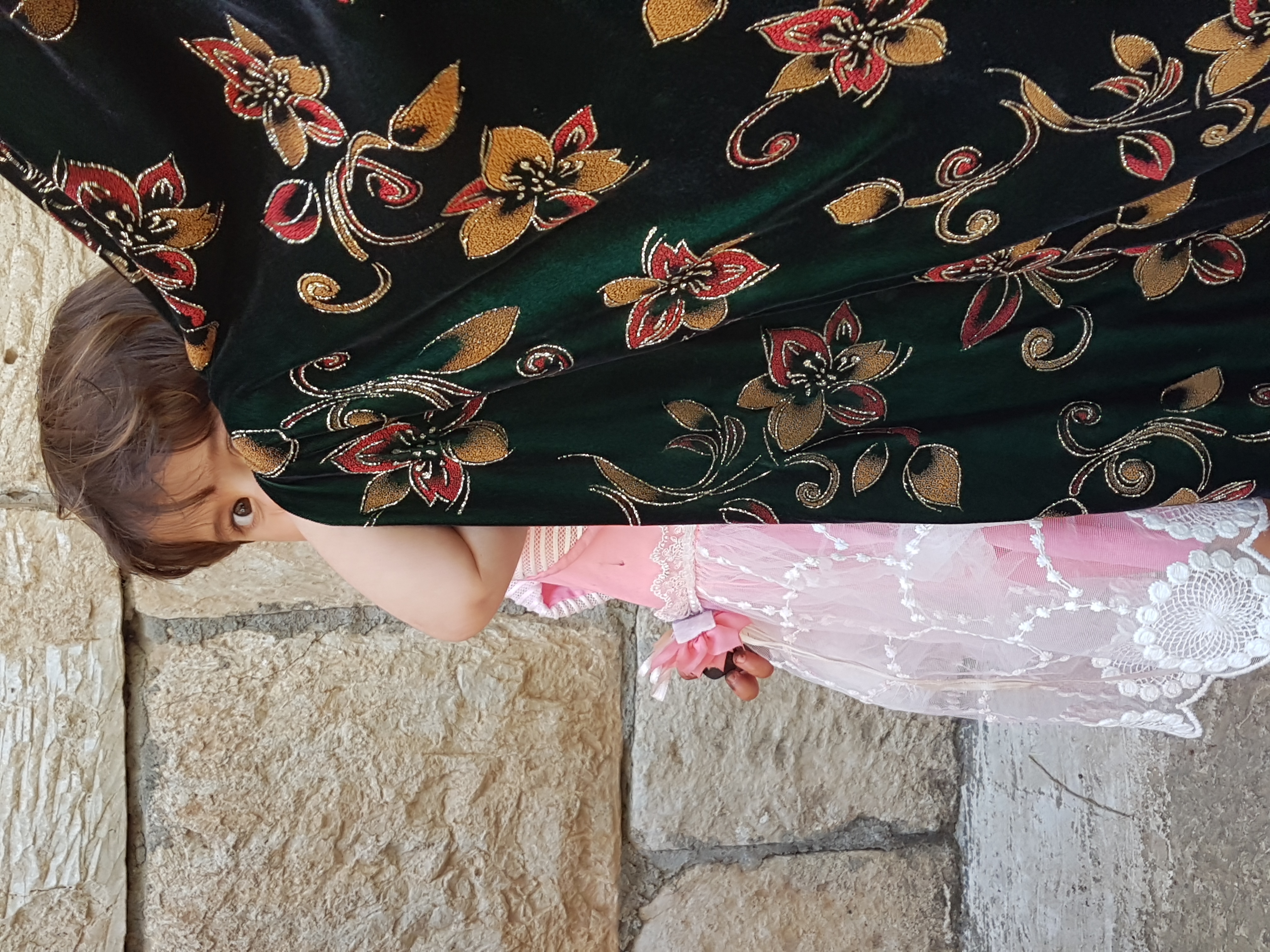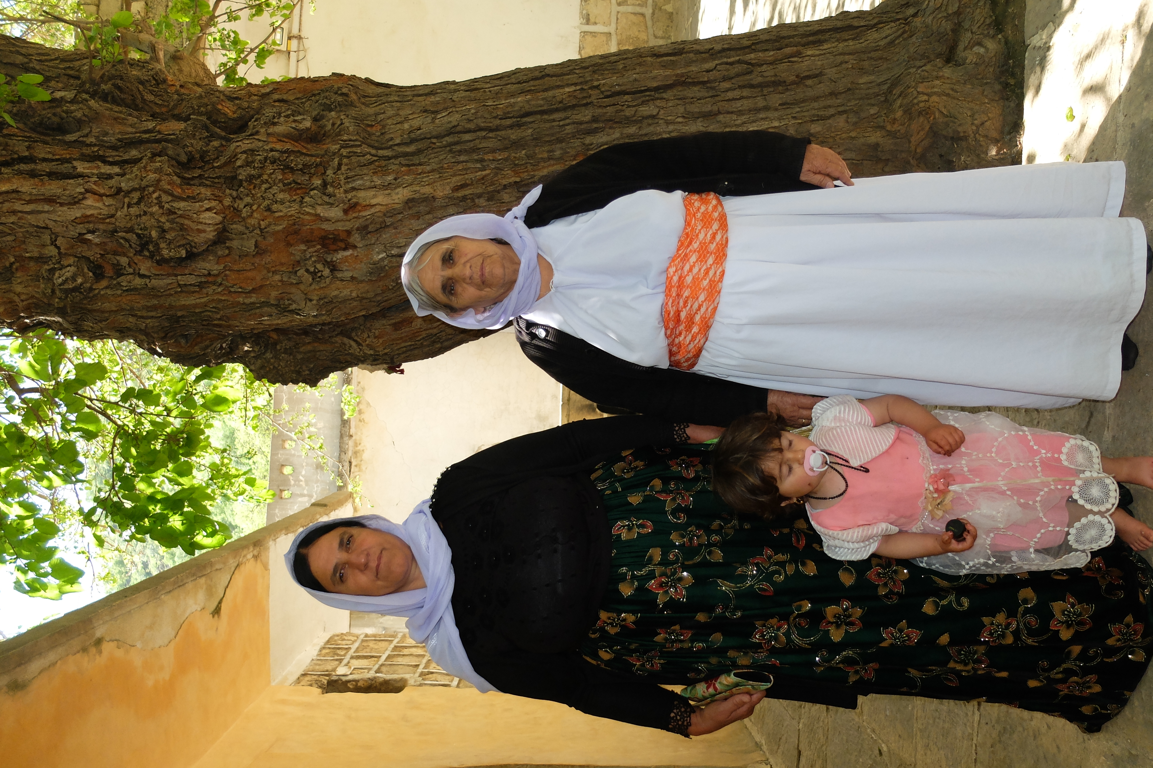 Yezidi gril, hiding a bit shy behind her mother's traditional Yezidi/Kurdish dress.