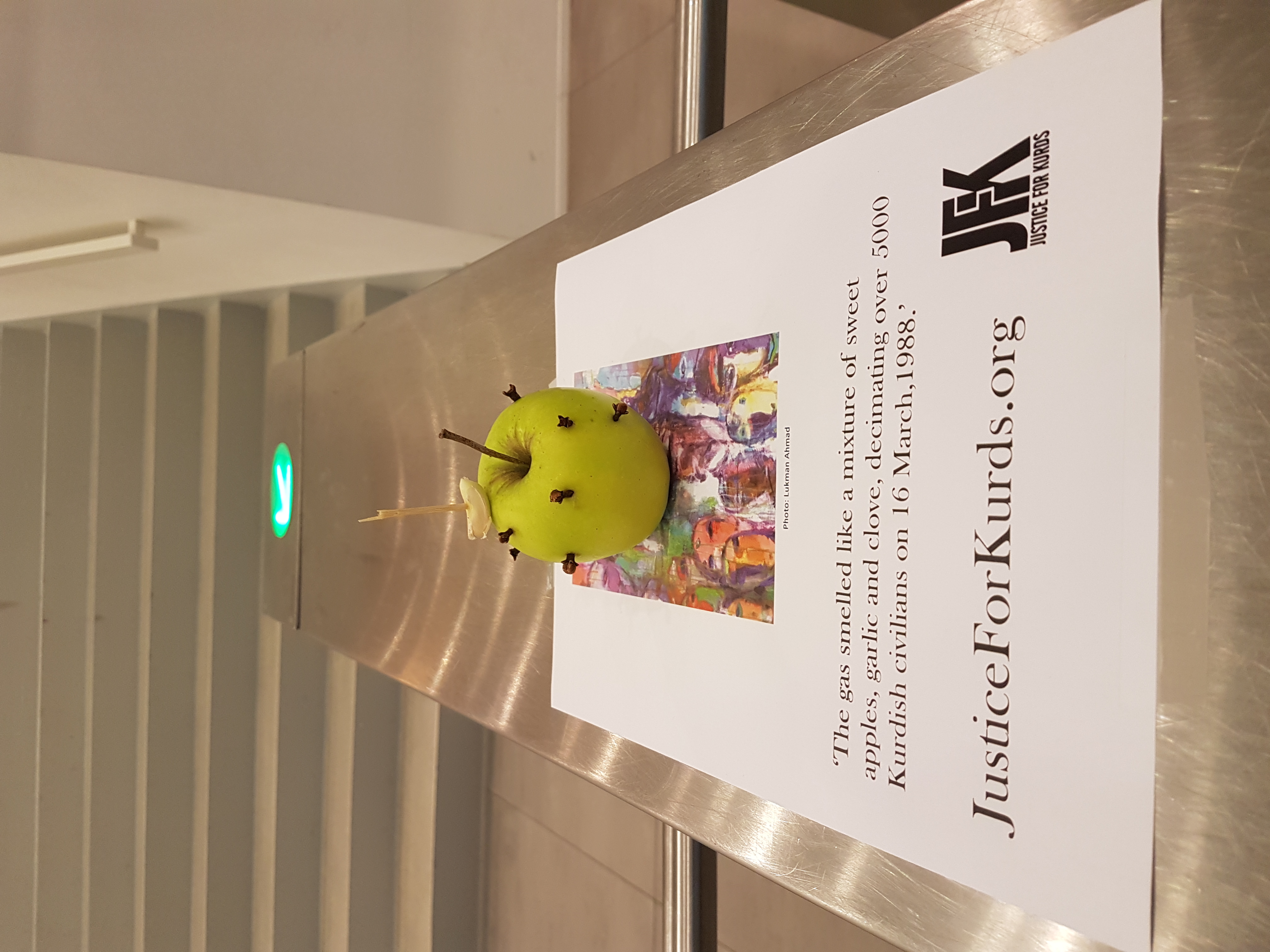 An apple with garlic garlic and clove, a symbol for the poisonous gas used at Halabja (part of Kavien's exhibition at LUC).
