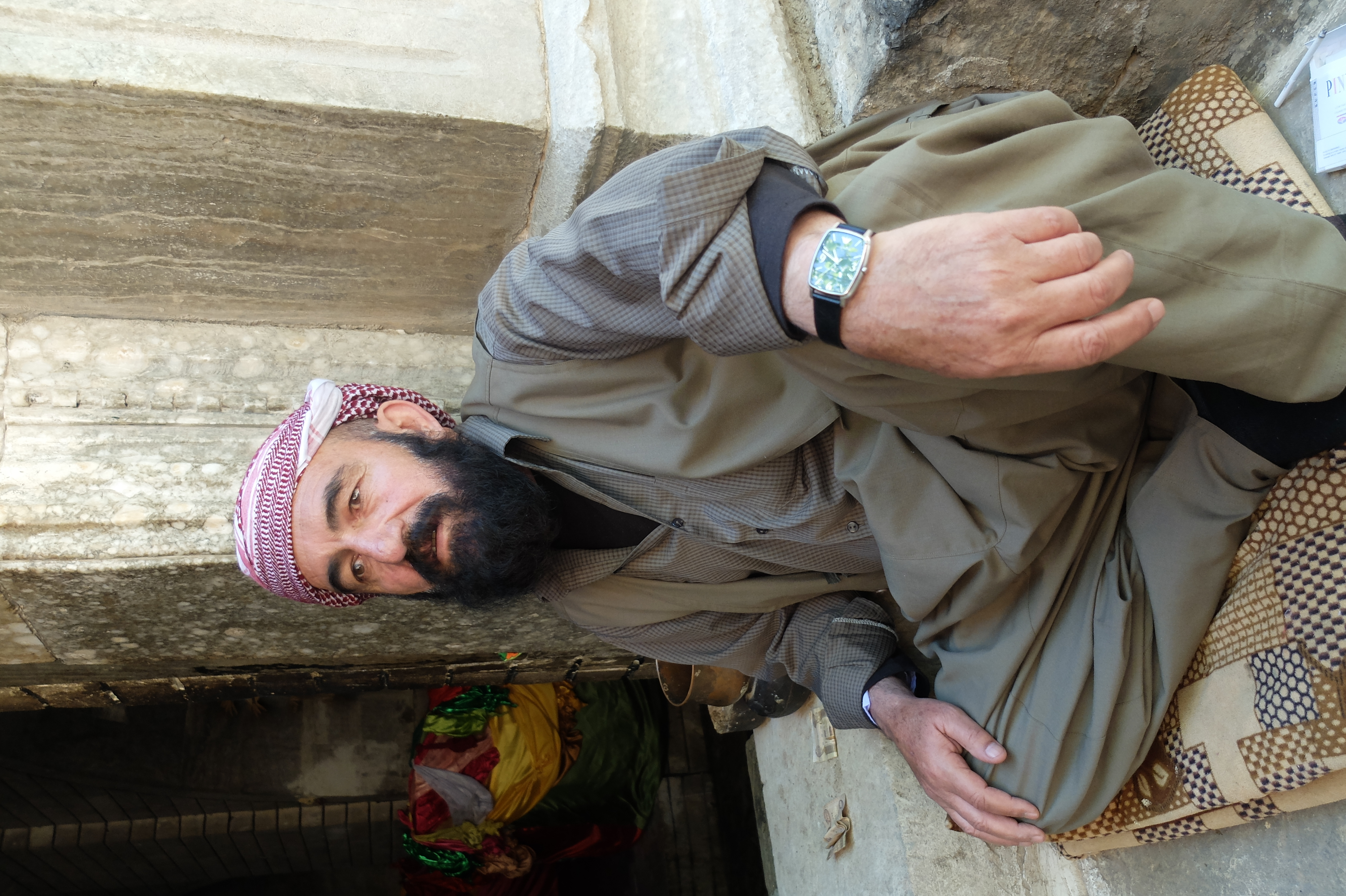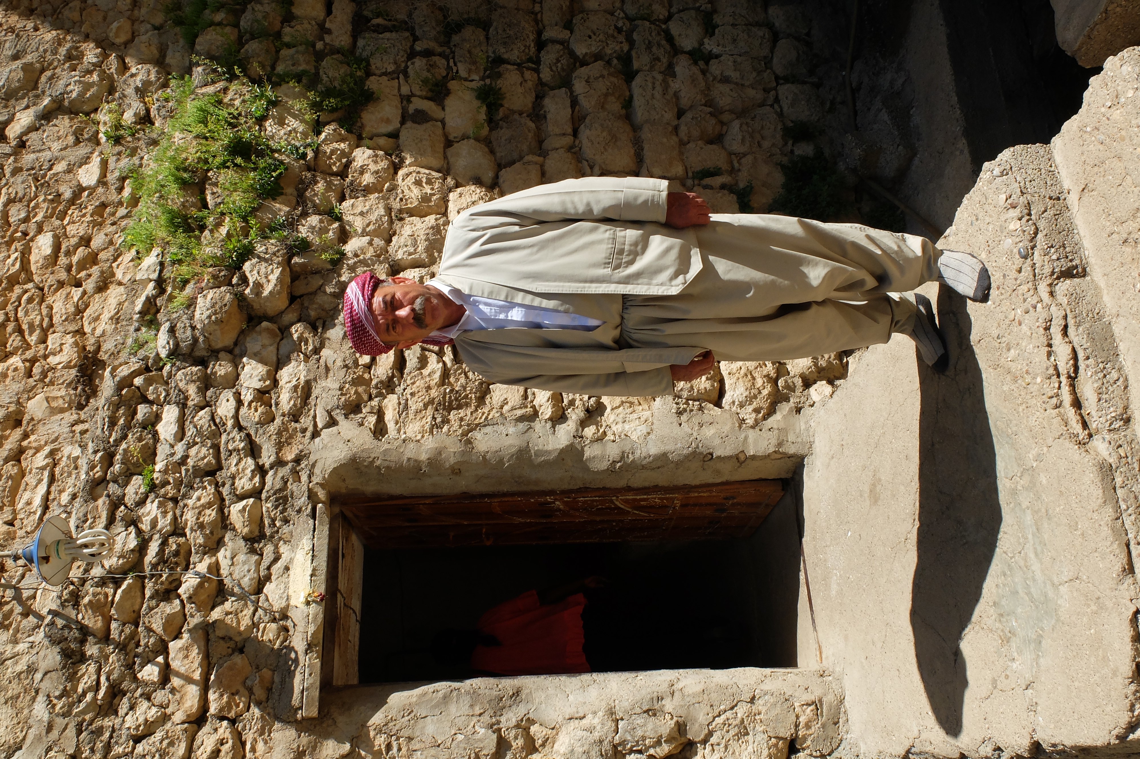 Man in traditional Yezidi outfit at the doorstep of his house.
