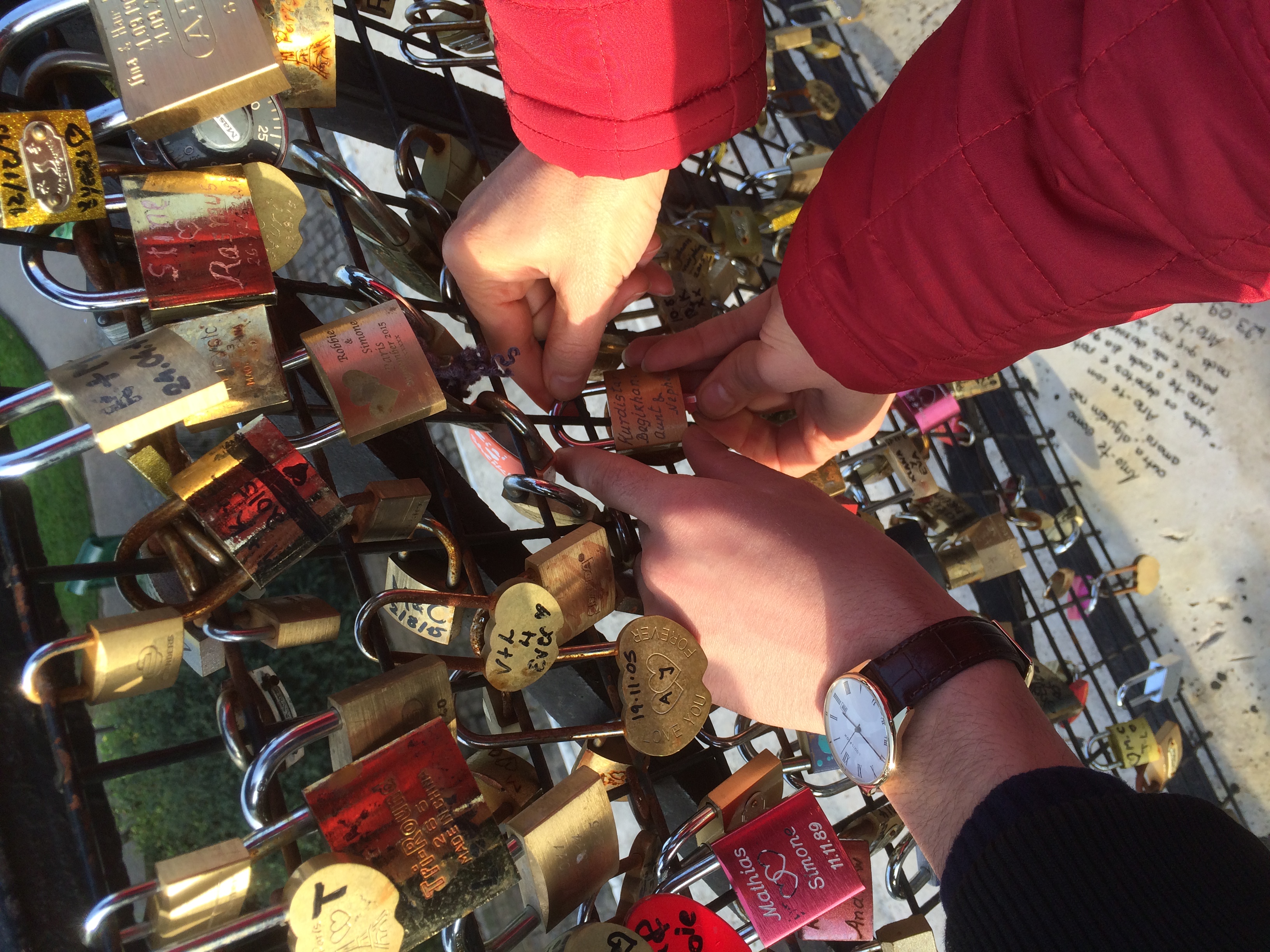 Kavien and aunt Nazand placing a lock on a Paris bridge.