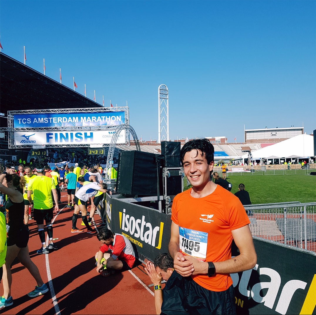 The photo shows Kavien just having completed the Marathon. This photo is proudly presented by VluchtelingenWerk, on the