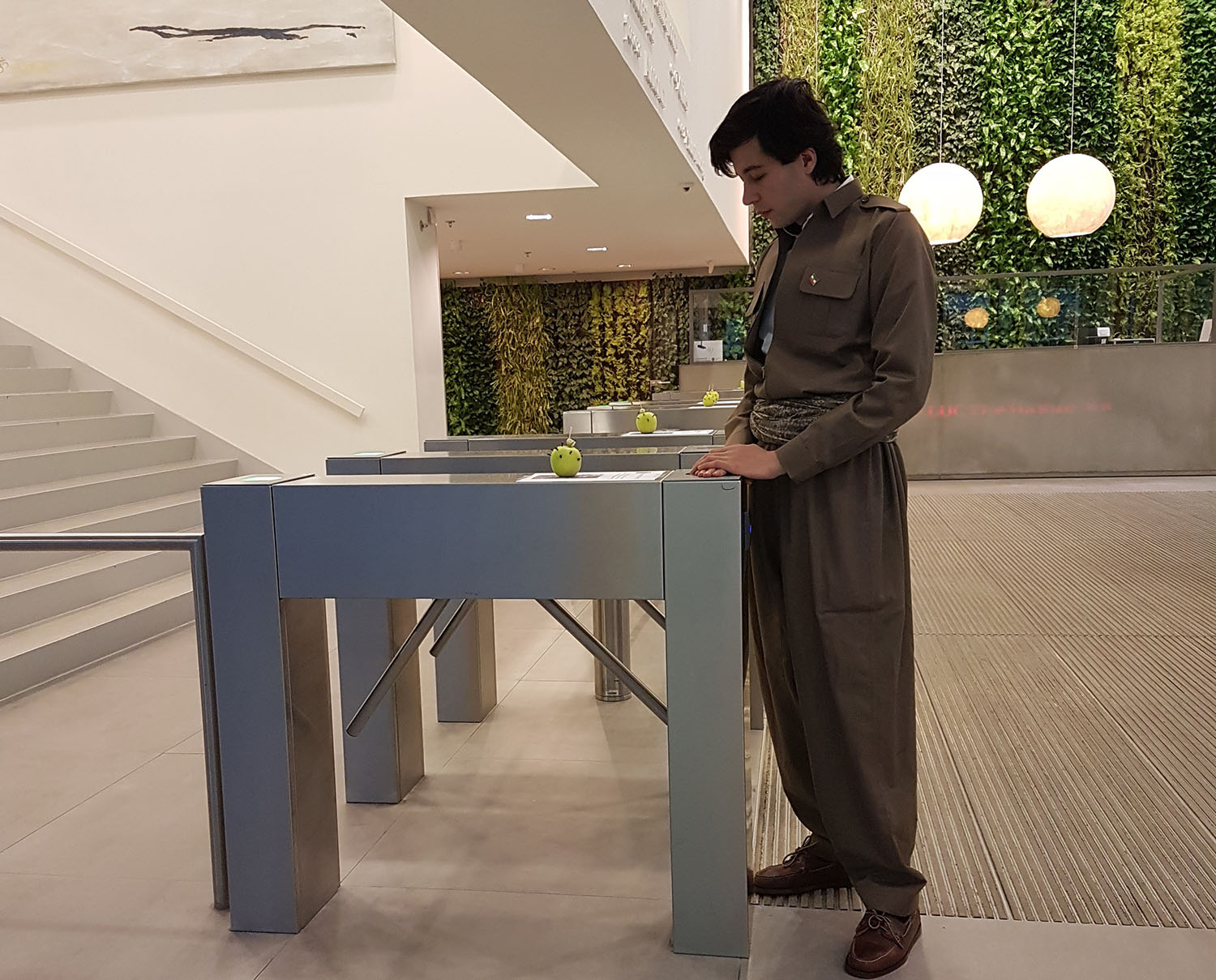 Kavien, at the entrance of LUC, wearing his special Kurdish garment (which he also used for the exhibition).