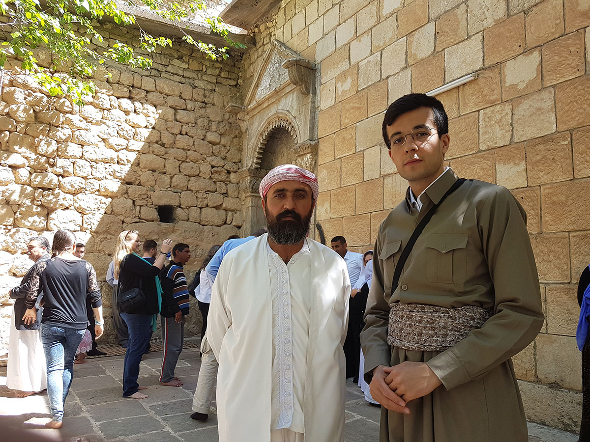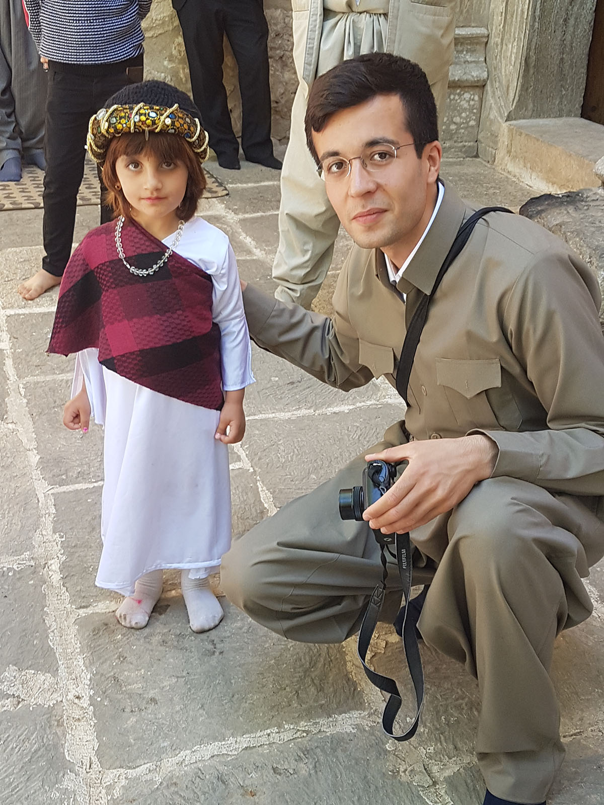 Kavien and a Yazidhi girl in traditional Yazidhi dress.