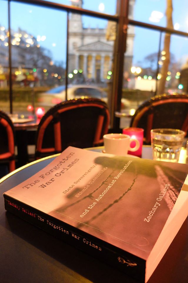 Kavien drinking coffee in a caf é, probably Paris, reading a book on War Crimes.